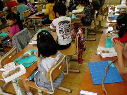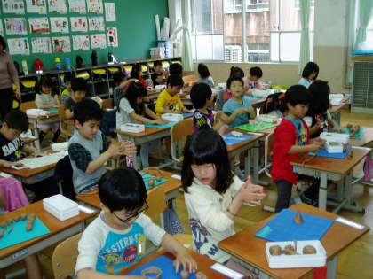 1年生は図画工作科の時間に『ねん土』を使っていろいろな形づくりをしていました。手を動かしながらも,いろいろなストーリーをつぶやいたり,『ねん土』を細長く伸ばして恐竜やキャンディに見立てたりしながら,友だちと楽しく活動していました。
