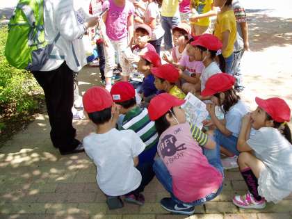 良い天候に恵まれ1・2年生は,動物園へ遠足に出かけました。初めに2年生は,時計と絵地図を受け取り,集合場所や時間を確認しました。
