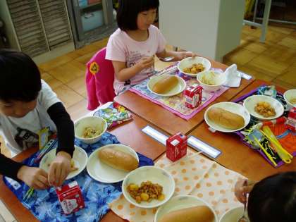 今日のメニューは『豚肉のケチャップ煮』『たっぷり野菜のビーフン』でした。子どもたちには馴染のあるケチャップ味の豚肉を一口食べるなり,「おいしい。」という感想が飛び出しました。