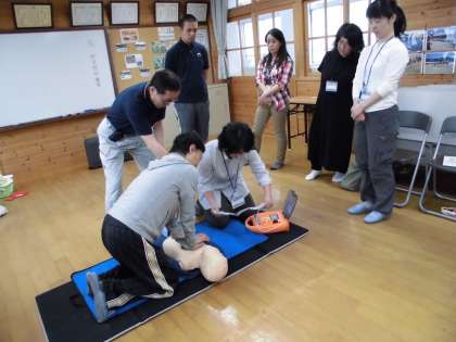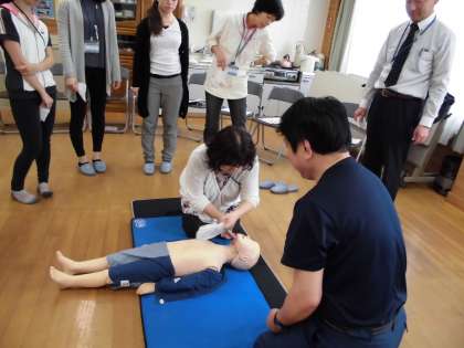 5月17日(火)北醍醐小学校で、伏見醍醐消防分署の署員の方と消防分団の方にお越しいただき、教職員のための救急救命講習会を開きました。もうすぐ始まる水泳学習や運動会など突然の事故や怪我等に対応できるように毎年行っています。子ども達が安全に楽しく活動できるように教職員一同、講習に取り組みました。