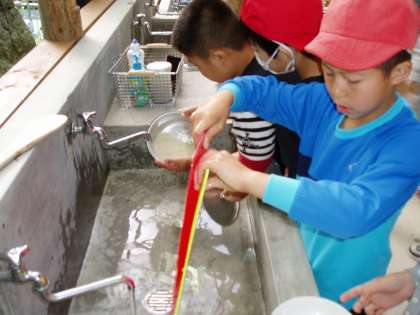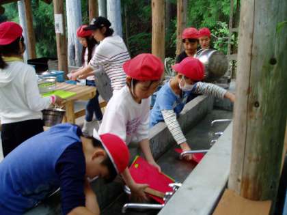 お米を研いだり,火をおこしたりと手分けしながら段取りよく作業を進めています。