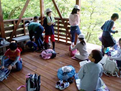 お昼前には山頂にたどり着き,みんなでお弁当をいただきました。昼食後は,木陰で爽やかな風を感じながら,思い思いに短い休憩を楽しみました。