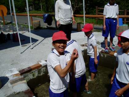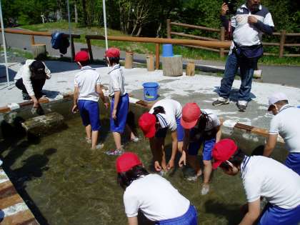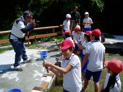 三日目の朝は,子どもたちが楽しみにしていた『魚つかみ』です。2つのグループに分かれて順番にイワナを追いかけました。