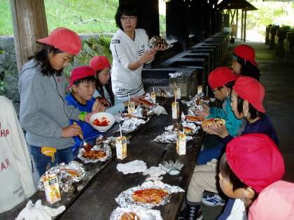 朝食をいただいた後は,自分から進んで後片付けもします。順番にパンを焼き,食べ終わったグループの子どもたちが,みんなで使ったカマドを掃除しています。