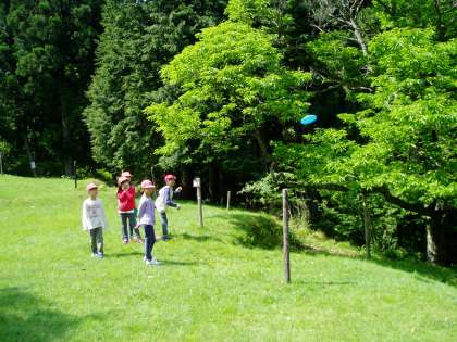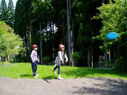 朝食を済ませ,みんなでフライングディスクゴルフを楽しみました。グループ対抗で競い合いました。良いお天気の中,短い時間でしたが大いに盛り上がっていました。