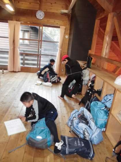 1日目の夜に,モリモリ食べてぐっすり眠った子どもたちは,眠い目をこすりながらも元気に6時には布団から出て2日目の用意をしました。テキパキ動けたので,次の活動の前に少し時間が持て,ケンケン先生に「うんちっち」というすてきな本を読んでいただき楽しみました。