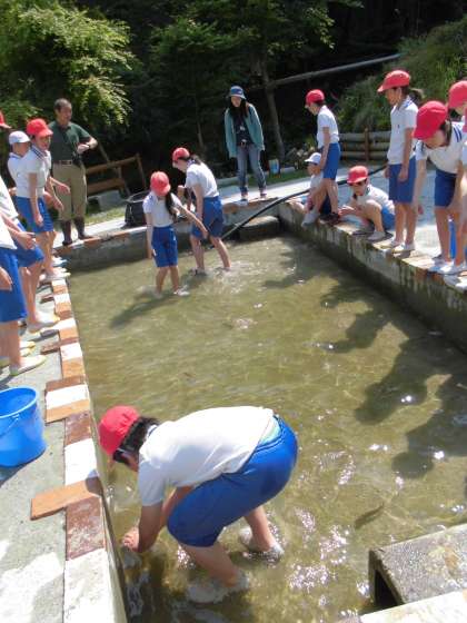 ハナコロ池に放たれたすばやく泳ぎ回る魚と格闘し,捕まえました。初めて直に魚にさわることに怖い思いも少しありましたが,追いかけるうちにCatchし「やったー!!」と叫ぶ子どもたちは,すでに怖さも吹き飛んでいました!