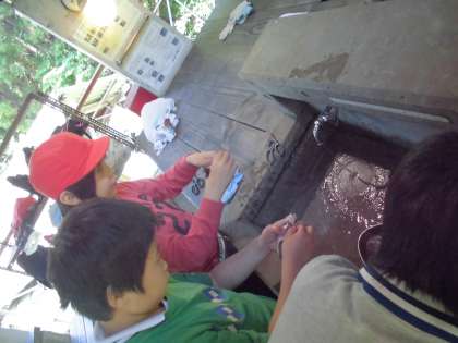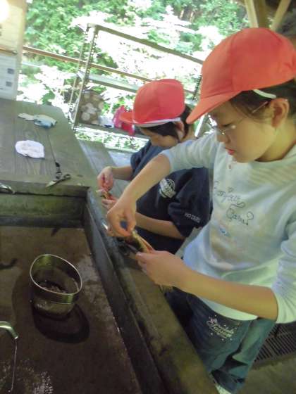 捕まえた魚を初めて自分の手でさばきました。魚をつかむのもこわごわで,調理ばさみでさばくこともこわごわの思いをもつ子どもたちでしたが,いざやってみるとなんとも上手に,美しくさばき,くしも上手にさし,意外な特技を見せてくれた子どもたちです。