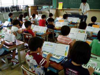 2年生の子どもたちは,3年生の担任である山本先生から音楽の学習を教わっています。今日は,オルガンのリズムに合わせて鍵盤ハーモニカで合奏していました。