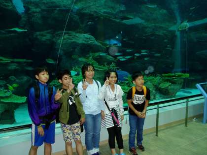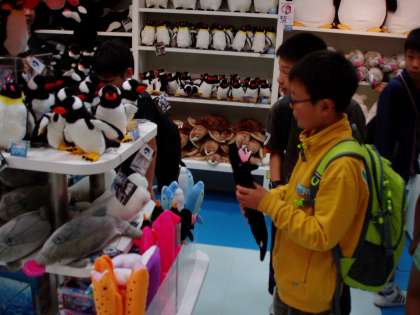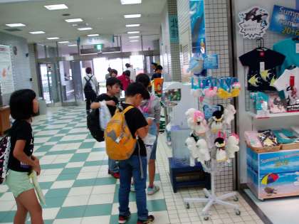 お弁当を食べた後は,水槽の前でグループごとに記念撮影をしました。そのあと,第1回目の買い物タイム(お土産購入)になりました。