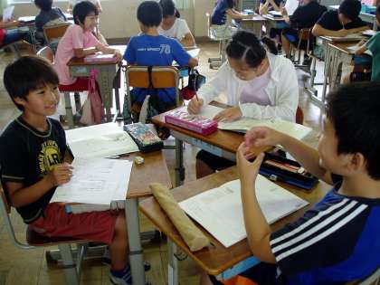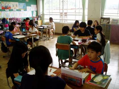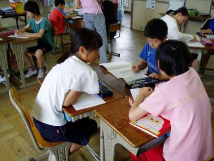 5年生は国語科の時間にインタビューの練習をしていました。インタビューをする側とされる側に分かれ,一つの質問に答えが返ってきた後,その答えに関連する質問を重ねていく練習をしています。
