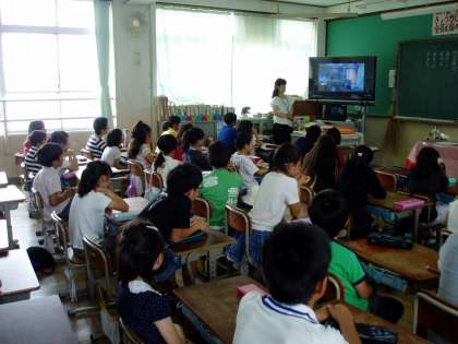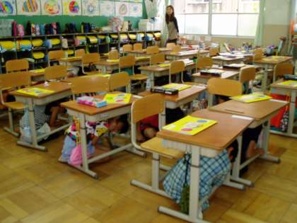 初めに教室で映像を見せながら安全指導をしたあと,緊急地震速報を聞き一次避難行動をとらせました。