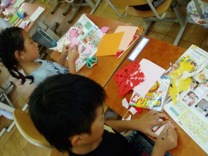 1年生は,図画工作科の時間にハサミを使って折り紙を切り『かざり作り』をしています。折り方や切り取る場所をかえることで,いろいろな模様が出来上がります。