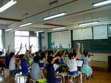 6年生の音楽科の時間です。今日は,パートの役割を知る学習をしていました。ピアノの演奏を聴き,主旋律であれば青色,副次的な旋律であれば黄色,響きを豊かにする和音であればピンク,響きを支える低音であれば青色のカードを挙げます。子どもたちは耳を澄まし,それぞれのパートを聞き分けていました。