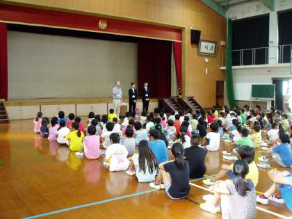 その後,夏休み中に行われた全市部活動(バスケットボール・卓球)での成績表彰が行われたり,明日から始まる『あいさつ運動』を代表委員の子どもたちが紹介してくれたりしました。