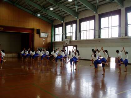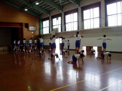 体育館では高学年の子どもたちが,組体操の練習をしていました。二人組を作り,技の出来栄えをレベルアップさせようと,話し合いながら技の完成を目指していました。