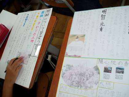 6年生は総合的な学習の時間に,自分たちが暮らす醍醐の街について調べていました。今回は,醍醐の歴史に深くかかわりのあった人物(豊臣秀吉や明智光秀,小野小町)やその人物に関わる歴史的な建造物(醍醐寺や随心院,醍醐天皇凌)について調べているようです。