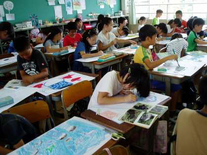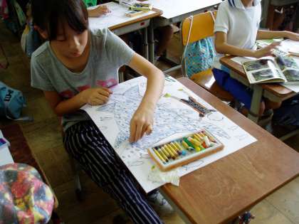 4年生の教室では図画工作科の時間に『お話の絵』に挑戦していました。子どもたちは5つのお話の中からお気に入りのお話と場面を選んで絵に表しています。