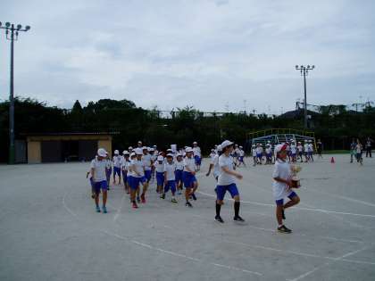 昨日に実施する予定でだった全校練習を今日の午前中に行いました。運動会の係活動で練習を重ねている合奏隊の音楽に合わせて入場行進の練習から始めました。