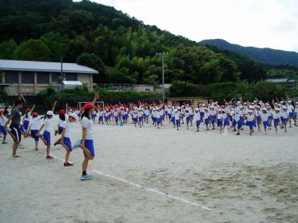 開会式の最後は,係の子どもたちが準備運動の動きを全校の子どもたちに伝えてくれて練習をしました。