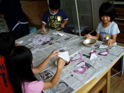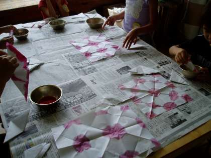 その作った『色水』の中に,折りたたんだ和紙の端を浸して,いろいろな模様を染め出していました。