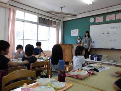 今日は3年生がランチルームでの給食です。ランチルームでは栄養教諭の内田先生から,「おいしい給食」についてお話を聞きました。子どもたちは「おいしい」とは「耳ー音」「鼻ー香(かおり・におい)」「目ー彩(いろどり)・形・大きさ」「口ー味(あじわい)・食感・温度」などで感じることができると知り,早速おうちの人に「今日の給食のおいしさを話したいな。」と楽しそうでした。