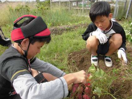 土の合間から,きれいな紫色のさつまいもが顔を覗かせていました。掘られたお芋は,図工で絵を描いた後,調理実習する予定です。