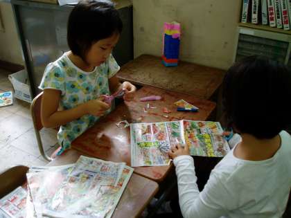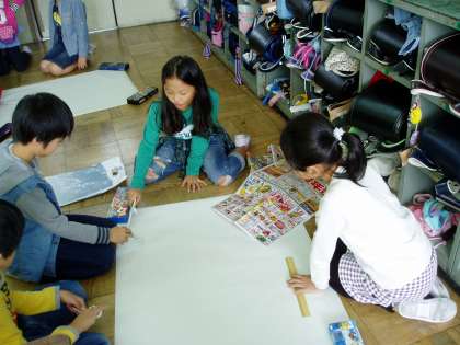 今日は,その発見を活かしてスーパーマーケットの様子や売られていたものを模造紙にかき表していました。
