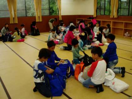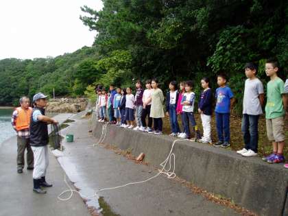 写真は,荷物整理を済ませ『かご漁体験』をしているところです。魚のえさを仕掛けに入れて準備完了です。明日の引き上げが楽しみです。