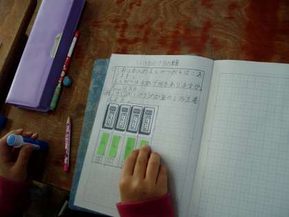 文章問題から具体的な場面を仮定し,今,自分たちが知っている計算方法を使って答えを導き出そうとしています。