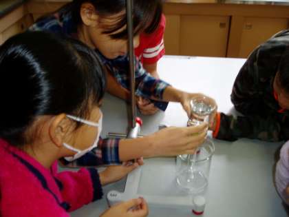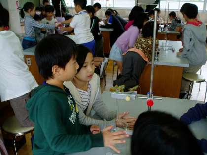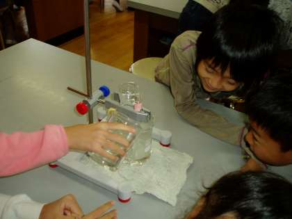 子どもたちは,「空気は押し縮められるけれど,水は押し縮められないので,温度を上げても体積は変わらない。」と,以前の学習内容から予想を立てたり,「空気と同じように,温度によって体積は変化する。」と前回の実験から予想したりして今日の実験に臨んでいました。