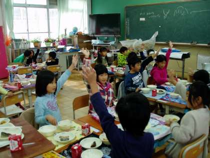 「『関東煮』のおかわりが,食べられる人はいますか?」という問いかけに,たくさんの子どもたちが元気よく手を挙げていました。
