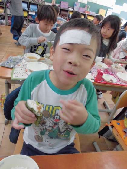 今日の給食は,セルフおにぎりでした。1年の教室では,長めののりを半分にし,のりの上にご飯をのせ,その上に具をのせて巻いて食べたり,先にご飯に具を混ぜて,のりの上においておにぎりにしたりしながら,どの子も笑顔で食べていました。