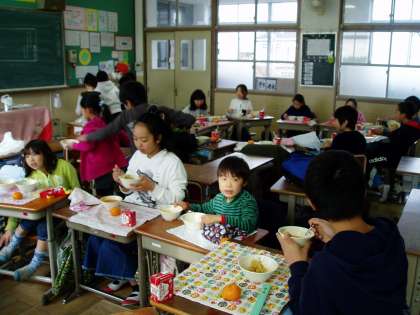今日の給食は,高塚グループ(たてわり班)に分かれてカレーピラフをいただきました。はじめは,普段の給食時間とは違う雰囲気に緊張している子どもたちでしたが,少しずつ会話も弾み,和やかな給食とになりました。