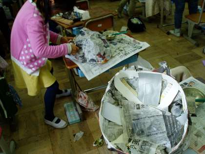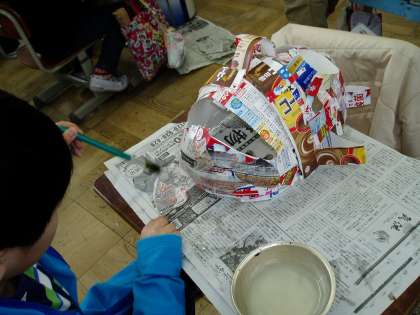 3年生は図画工作科の時間に,牛乳パックや新聞紙を利用して『鬼の面』を作っています。子どもたちは,出来上がりを想像しながら牛乳パックで面の骨格を作り,糊で新聞紙を貼り付けていました。