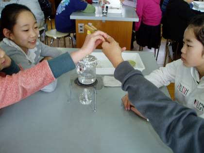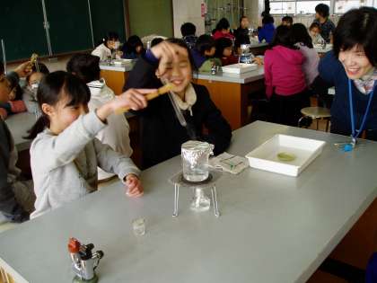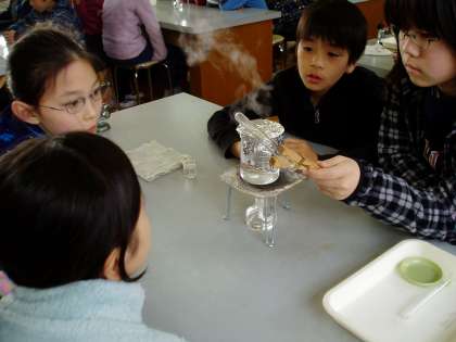 4年生は理科の学習で,水が沸騰した時に出る泡の正体を調べる実験をしていました。子どもたちは,その泡は空気に違いないと予想しますが,実験を通してその正体を突き止めていきます。