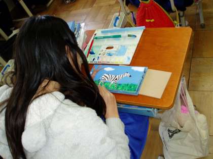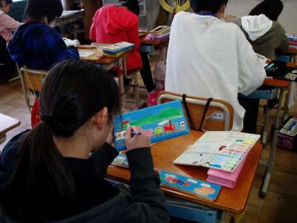 6年生の教室では,図画工作科の時間に思い出をデザインした制作活動に取り組んでいました。一人一人が,思いを込めてデザインを描いたり,色をつけたり,彫刻刀で飾り彫りをしたりしています。