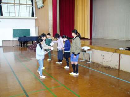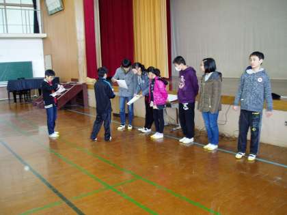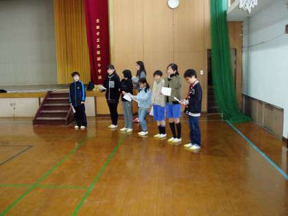 今日の朝会では,先日実施した『なわとび大会』の記録発表と表彰が代表委員の子どもたちで行われました。最初に,縦割り班で挑戦した大縄跳びの団体表彰が行われました。