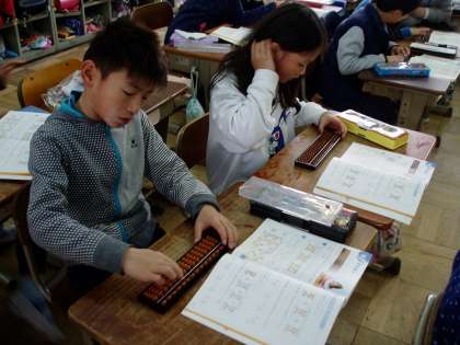 3年生は,算数科の学習で『そろばん』に挑戦中です。始めたばかりの学習なので,まずは基本から学んでいます。