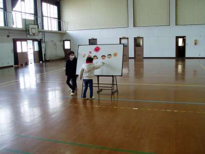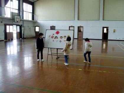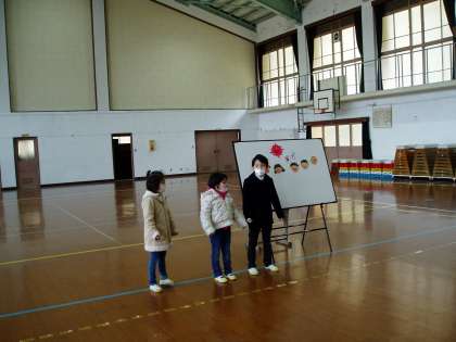 今日は6年生が遠足に出かけているため,あすなろ学級の低学年は三人でお留守番です。でも,6年生が出かけている今日こそ,『6年生を送る会』での出し物を練習するチャンスです。パネルシアターを使って,6年生にどんなプレゼントをするのか楽しみです。