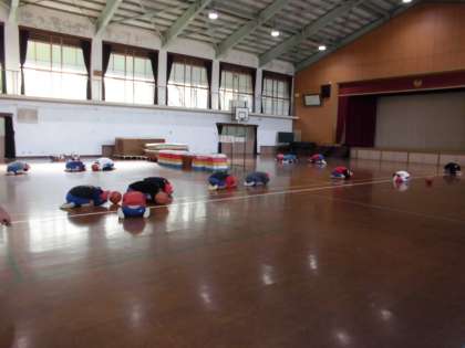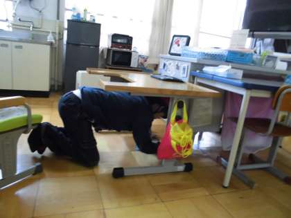 北醍醐小学校では,昨年からこのシェイクアウト訓練をはじめ,様々な災害を想定し,避難訓練を行ってきました。そのため,子どもたちは災害発生の放送に反応し,自ら「Drop(まず低く)」「Cover(頭を守り)」「Hold on(動かない)」の行動を身につけています。