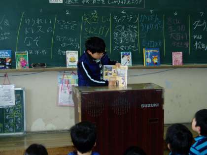 3年生の教室では,お気に入りの本を紹介し,どの本が一番読みたいかを参加者全員で決めるビブリオバトルが開催されていました。