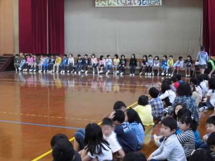 今日は「一年生を迎える会」が二時間目にありました。最初は,6年生のお兄さんお姉さんと手をつないで,ひとり一人入場です。6年生に名前を呼んでもらい,大きな声で「はい」と返事ができました。代表委員さんの司会で,「一年生を迎える会」が始まりました。みんなとてもうれしそうです。