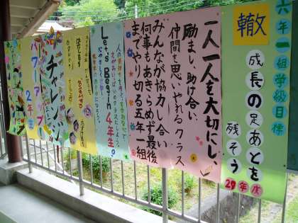 クラスの学級目標が渡り廊下に掲示されています。今月の朝会でも各学級の代表児童がお知らせしてくれた目標です。