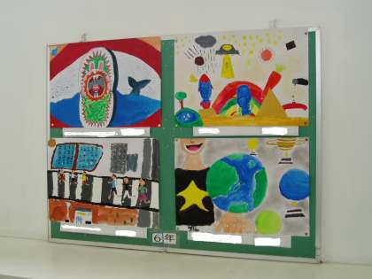 北校舎西階段の掲示板に6年生の新しい作品が掲示されました。子どもたちは想像力を大いに働かせ,空想の世界を絵にしていました。