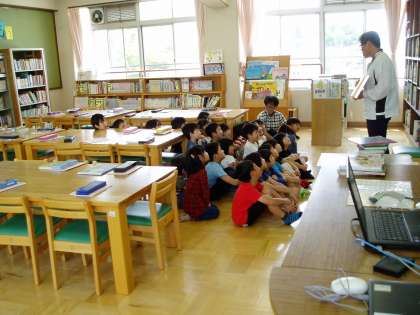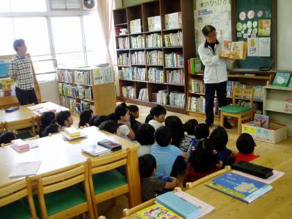 次に,図書支援員の方から読み聞かせをしてもらいました。楽しい絵本の内容に引き込まれ,あっという間にベルが鳴ってしまいました。子どもたちは,絵本の続きを大変楽しみにしていました。