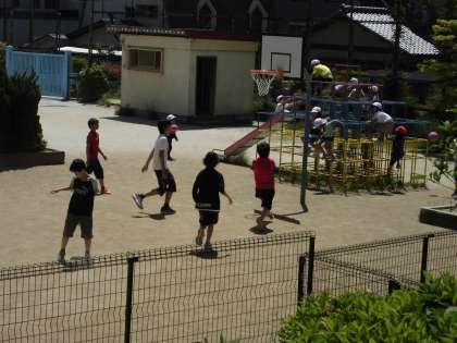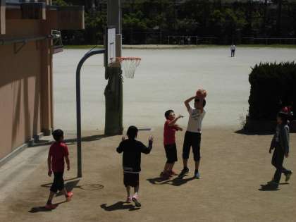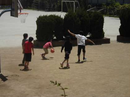 爽やかな5月,中間休みや昼休みには運動場に元気に飛び出す子ども達。その中でも高学年の子ども達は,男女一緒にバスケットを楽しんでいます。新しいバスケットコートでドリブルしたり,フリースローをする姿はとてもイキイキしています。