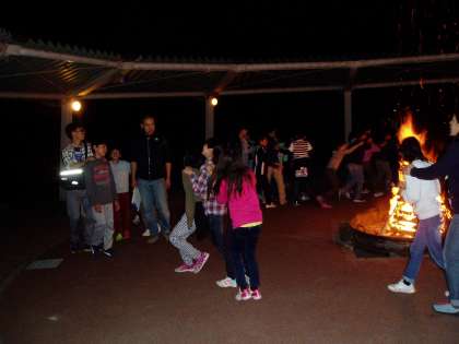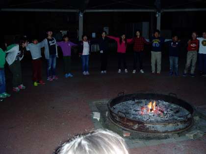 昨夜のキャンプファイヤーの様子です。係りの子どもたちが,キャンプファイヤーを進行しています。