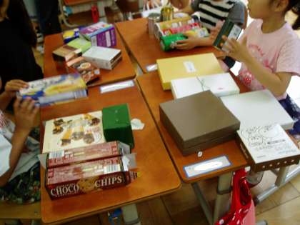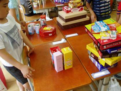 今日は,いろいろな入れ物を持ち寄り,形に注目して『仲間わけ』をしています。1年生の子どもたちが,どこに注目して『仲間わけ』をしたのかをグループごとに発表しています。