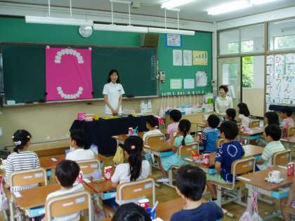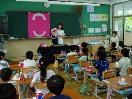 今日は1年生の『歯磨き巡回指導』がありました。ゲスト・ティーチャーとして本校の学校歯科医のドクターと巡回指導員の方をお迎えし,学習を進めていただきました。